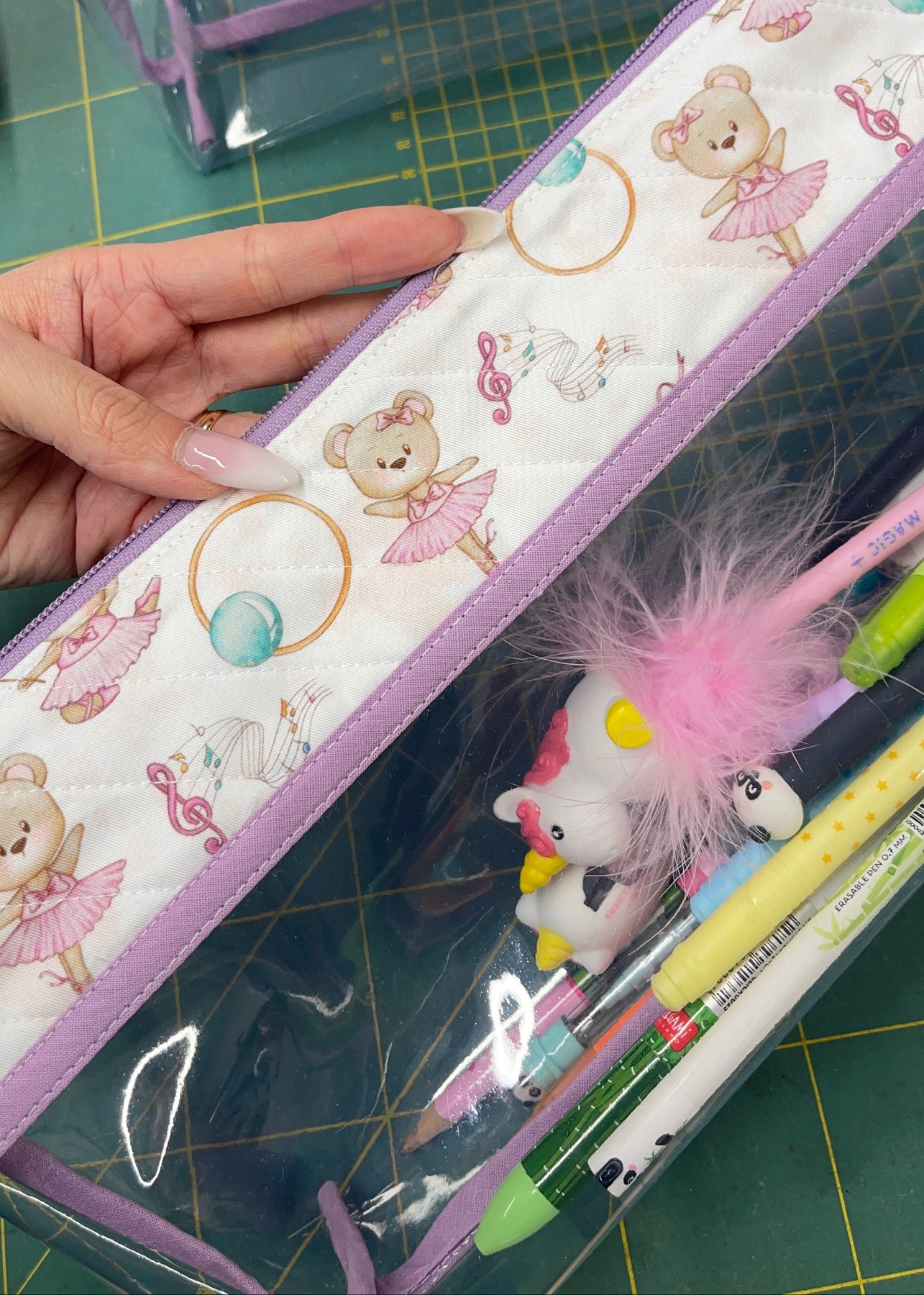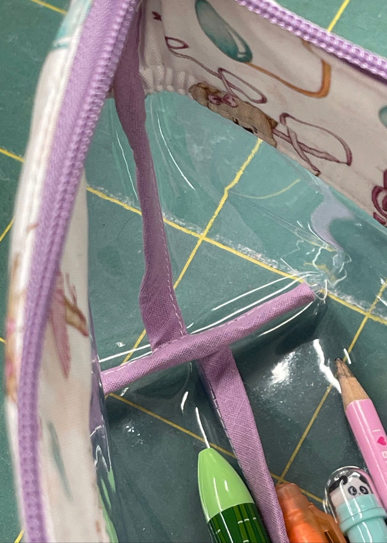 Sono realizzati a mano utilizzando i miei tessuti esclusivi, disegnati da me, abbinati a tessuto plastico trasparente, resistente e facile da pulire.